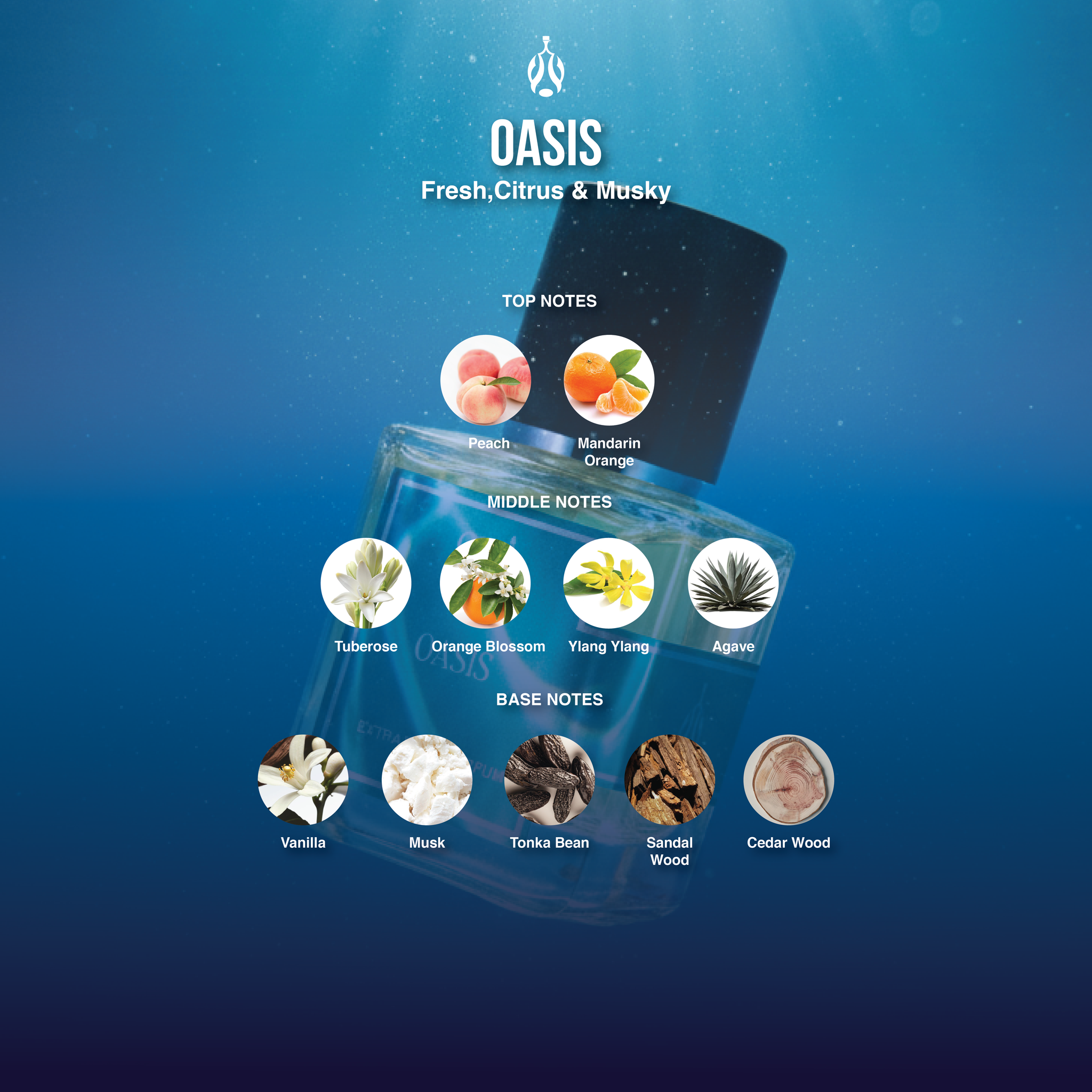 Oasis is a radiant and refreshing fragrance that feels like an escape to a calm paradise. Crafted as an Extrait De Parfum, Oasis delivers a soft yet captivating scent trail that transports you to a warm sunset by the beach.