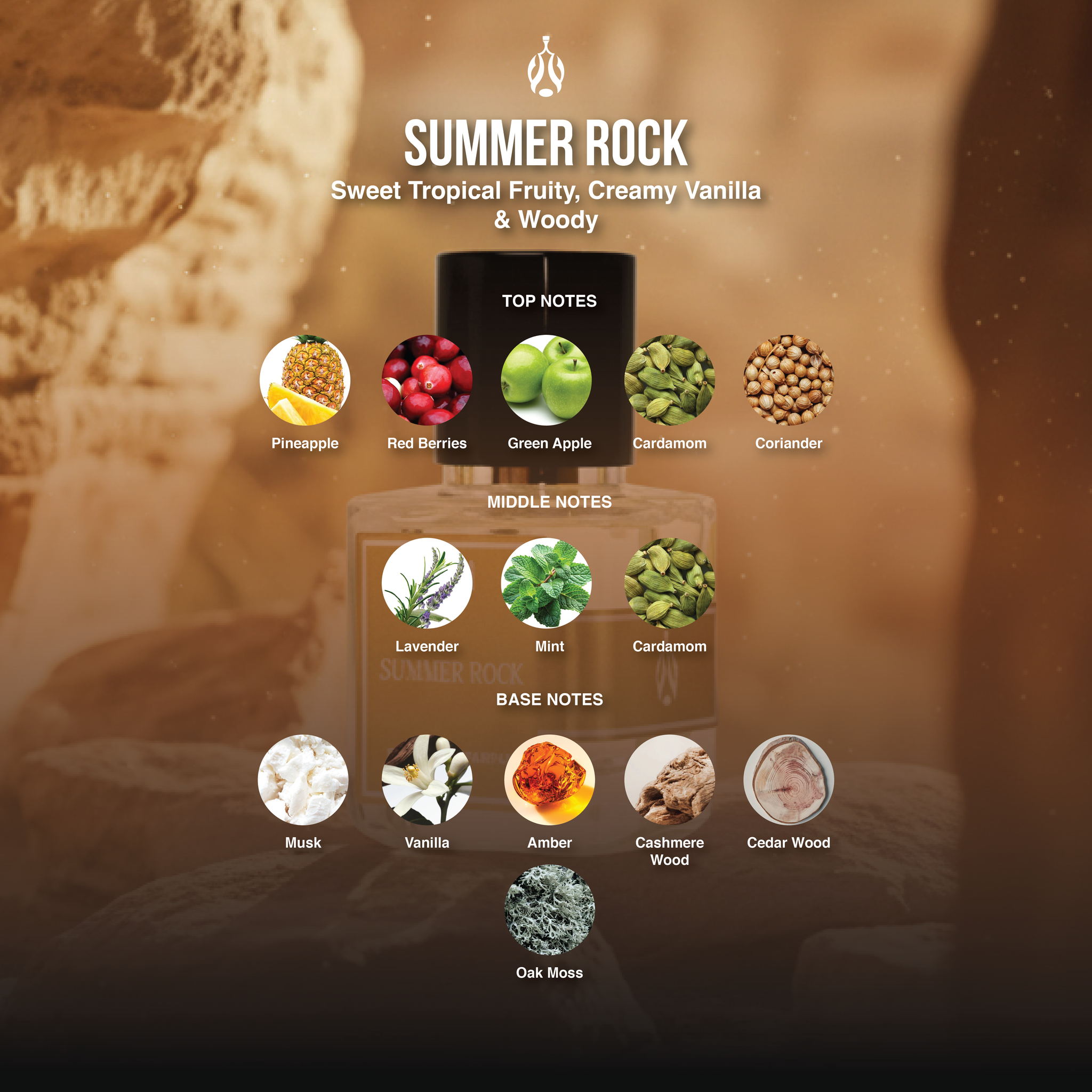 Summer Rock is a vibrant and refreshing unisex perfume that captures the spirit of summer with its fruity and floral blend. Designed for those who crave energy, confidence, and sunshine in a bottle, Summer Rock opens with a juicy burst of pineapple, berries, and apple, balanced with warm cardamom and a hint of coriander.